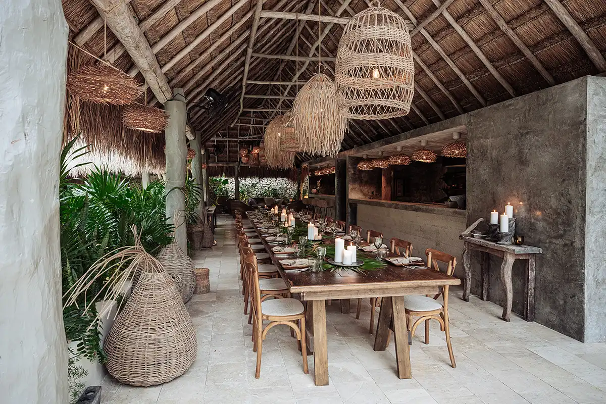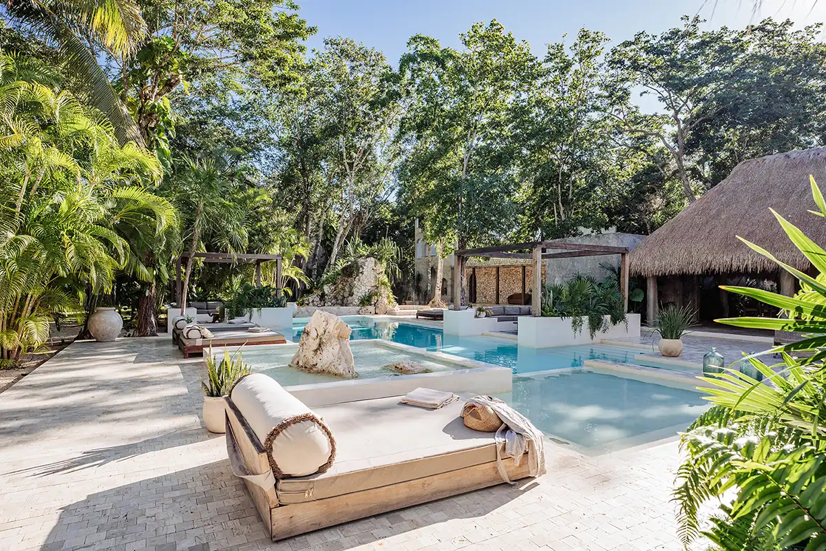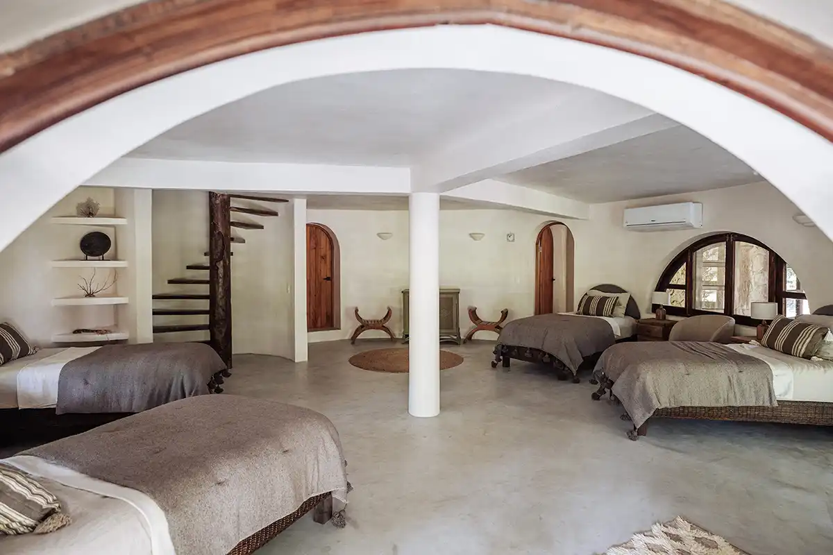 The Corazón Beach Bungalows are a bohemian beachfront estate on Soliman Bay, made up of three private two-bedroom bungalows. Nestled between palm trees and the calm turquoise waters of the bay, it’s the perfect setting for laid-back luxury, combining barefoot simplicity with effortless comfort. With six bedrooms across three bungalows, the estate comfortably hosts up to 14 guests. A shared beachfront pool, shaded hammocks, kayaks, and daily housekeeping make group stays seamless, while each bungalow features its own terrace for privacy. The bungalows can be rented individually for smaller groups or together as a full estate buyout for larger gatherings.
